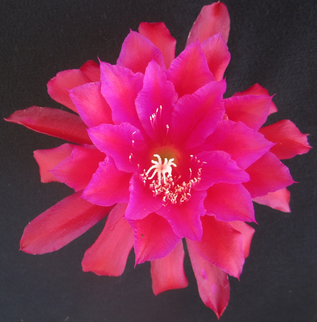 First two rows of inner petals dark purple-red with a narrow red midstripe. Third row red with pink-purple edge. Outer petals dark purple-red. Double, funnel-form. Flat tall basket growth. {L} ‘Bob Grimshaw’ × ‘American Sweetheart’.
